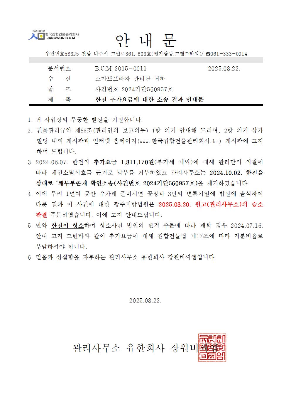 (스마트)한전 추가요금에 대한 소송 결과 안내문