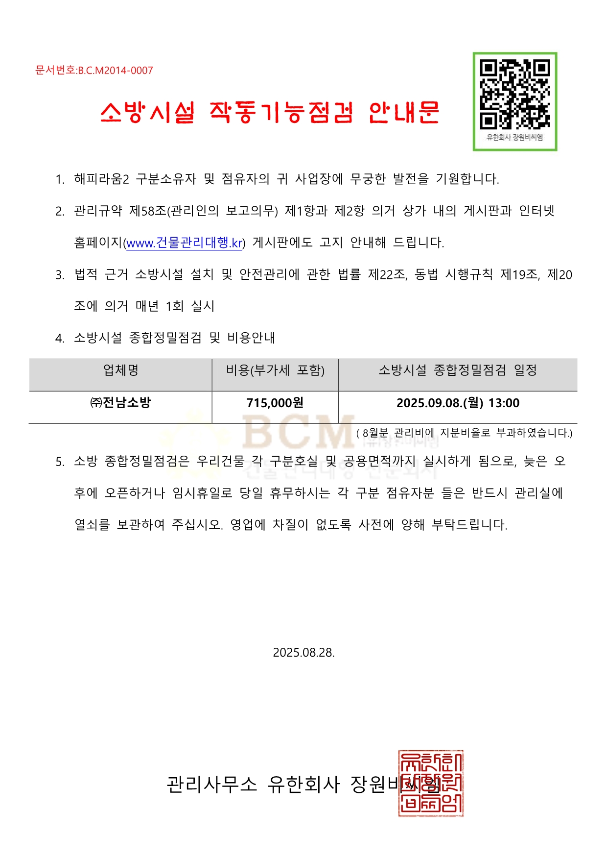 (해피라움2차)소방시설 작동기능점검 안내문
