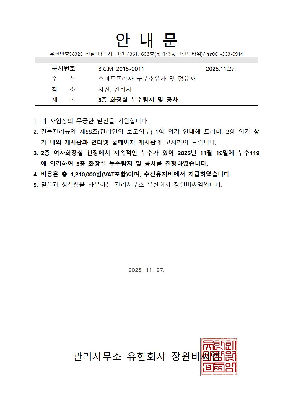 (스마트프라자)3층 화장실 누수탐지 및 공사