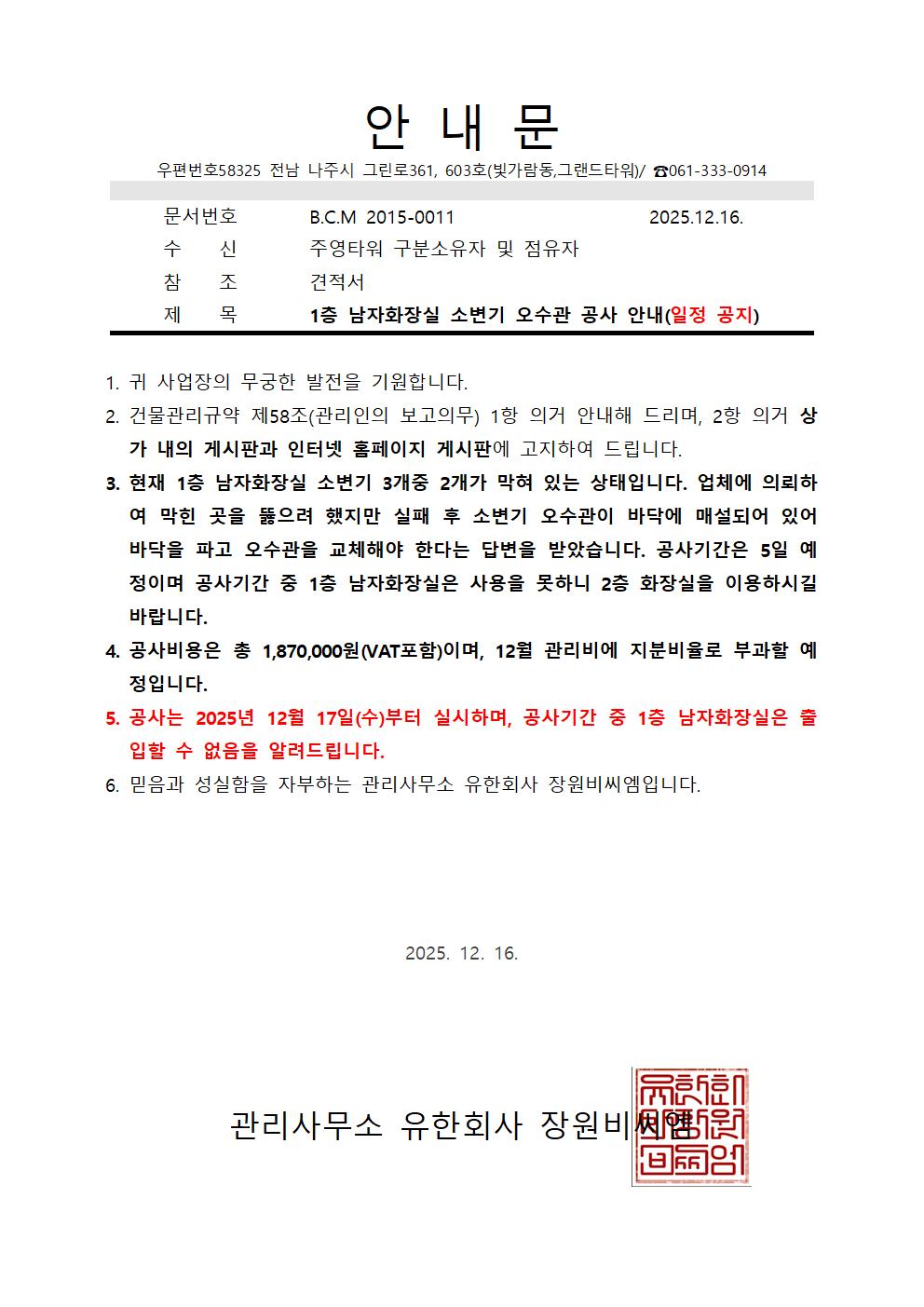 (주영타워)1층 남자화장실 소변기 오수관 공사 안내(일정 공지)
