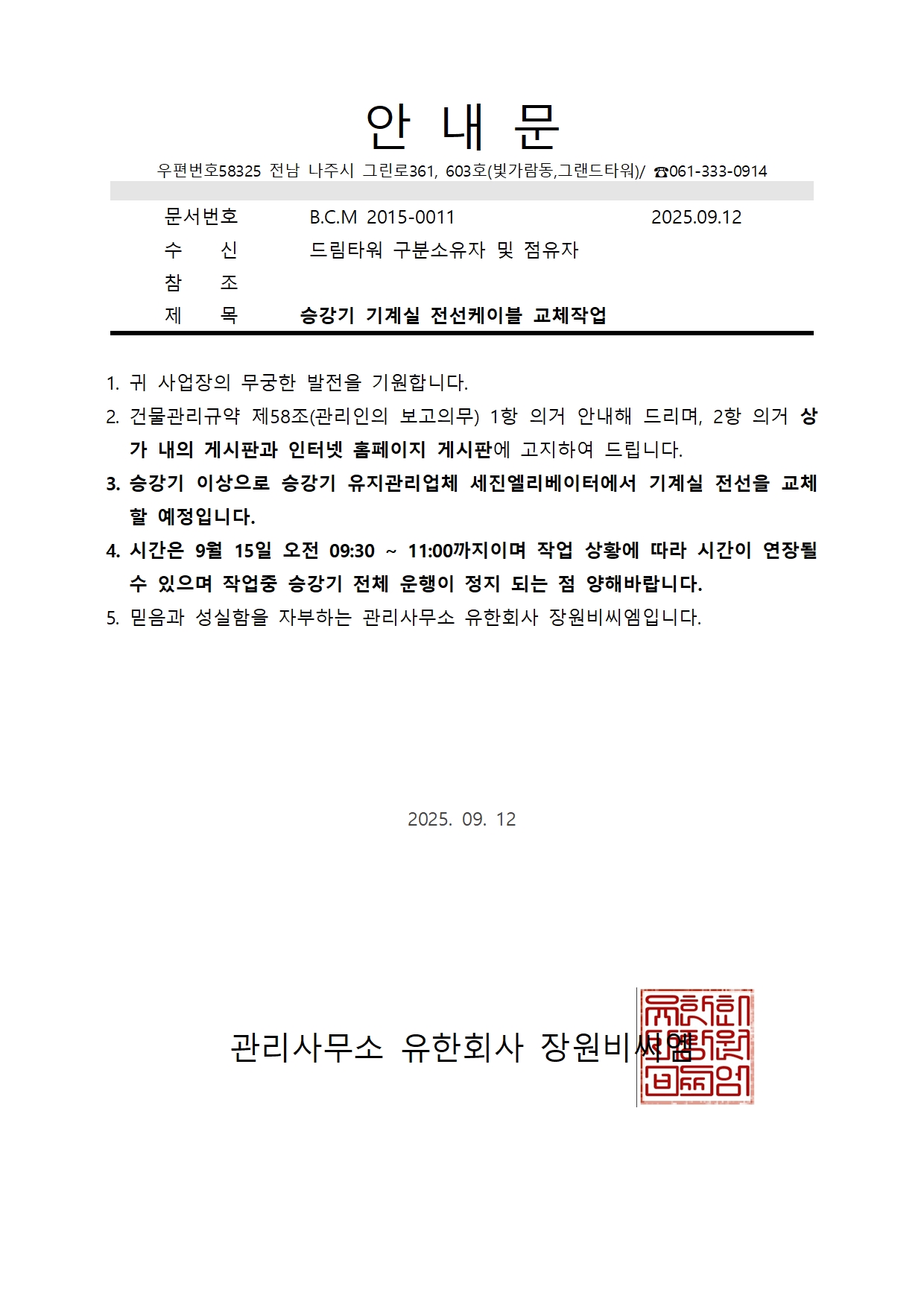(드림타워) 드림타워 승강기 기계실 전선교체 안내문