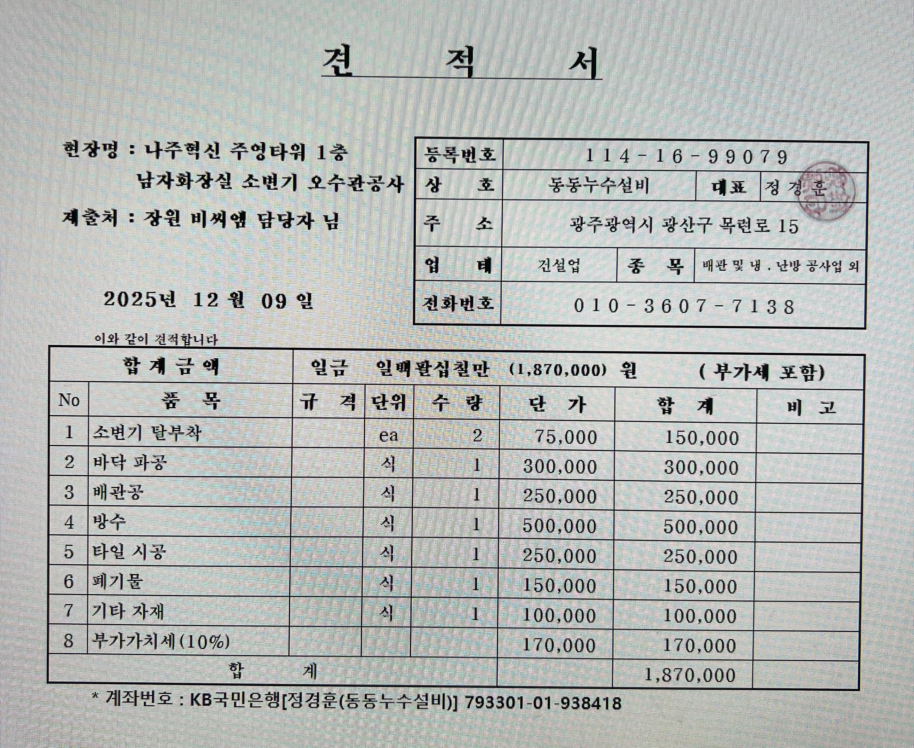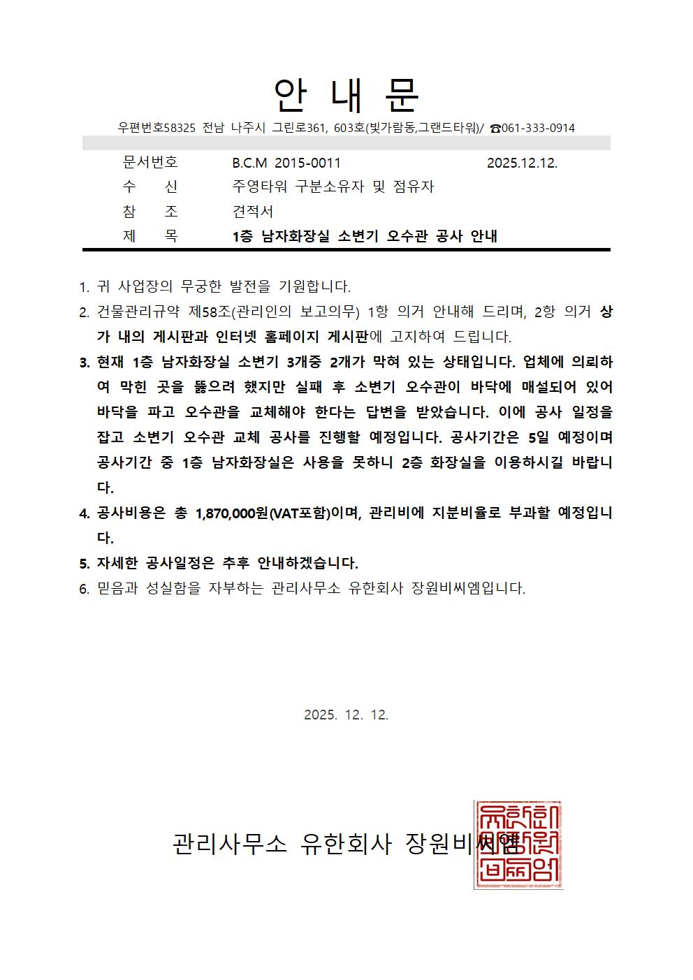 (주영타워)1층 남자화장실 소변기 오수관 공사 안내