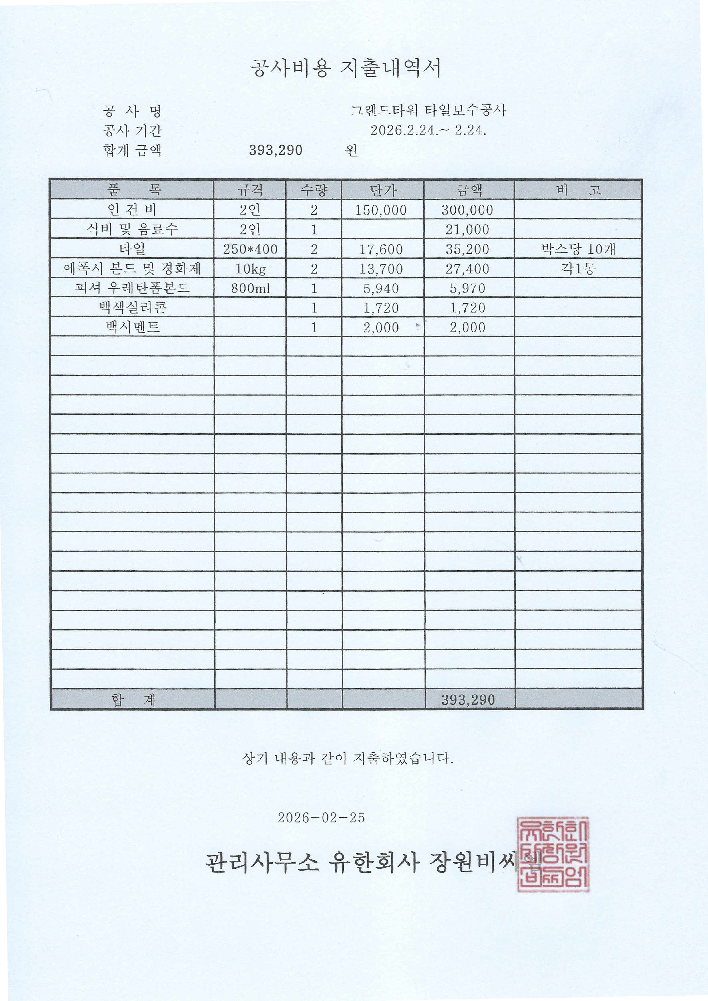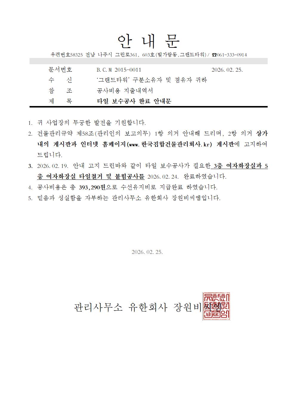 (그랜드)타일 보수공사 완료 안내문