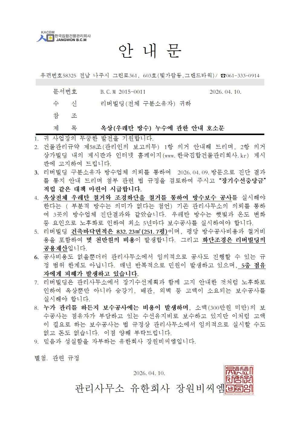 (리버)옥상(우레탄 방수)누수에 관한 안내 호소문