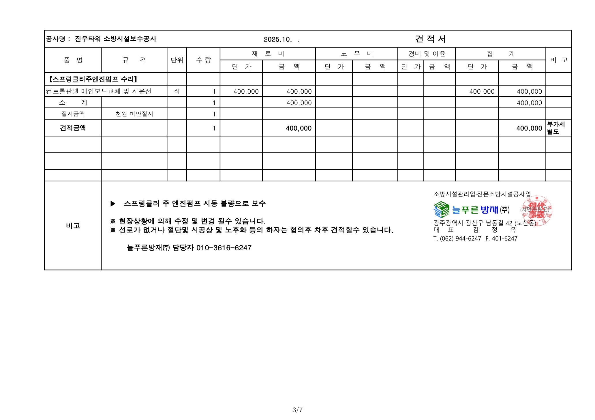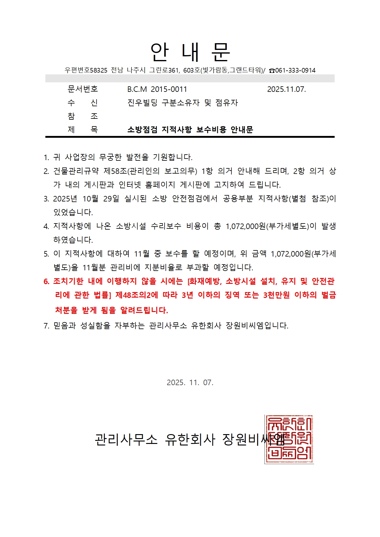 (진우빌딩) 소방시설 지적사항 보수공사 안내문