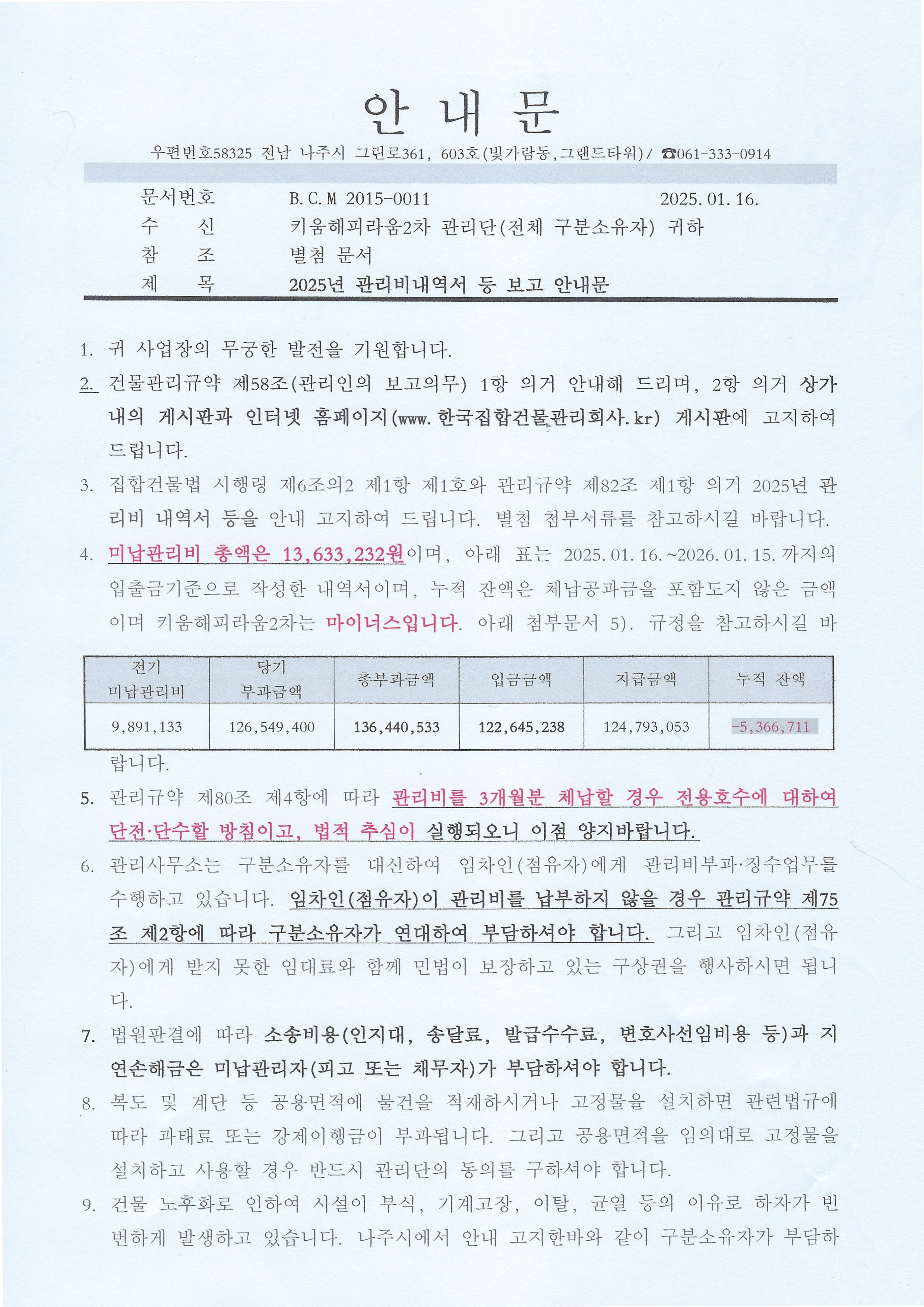 (해피2차)2025년 관리비내역서 등 보고 안내문
