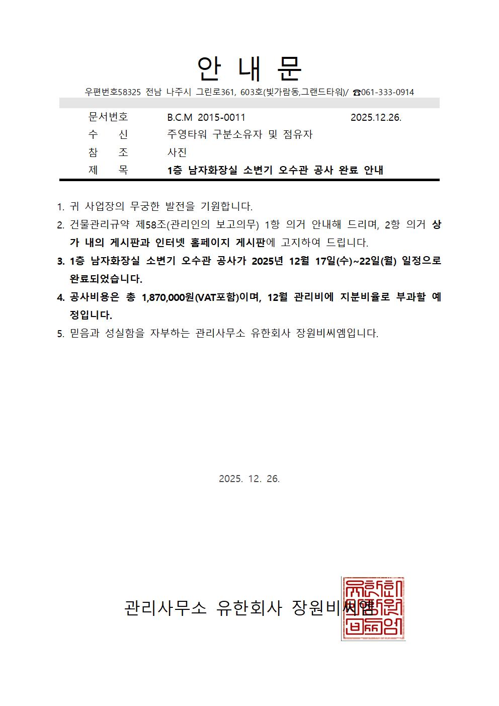 (주영타워)1층 남자화장실 소변기 오수관 공사 완료 안내
