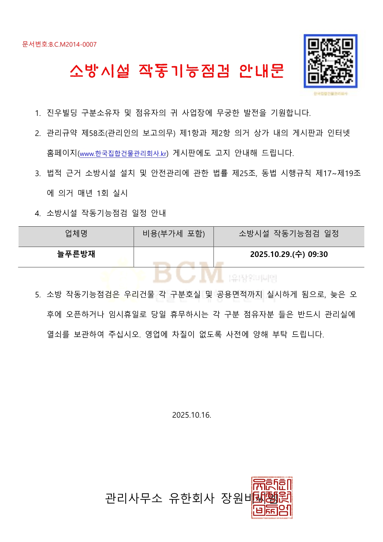 (진우빌딩) 소방시설 작동기능점검 안내문