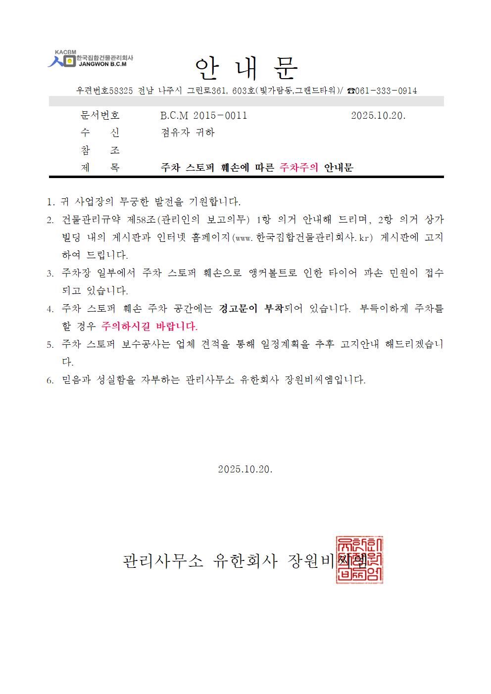 (드림)주차 스토퍼 훼손에 따른 주차주의 안내문