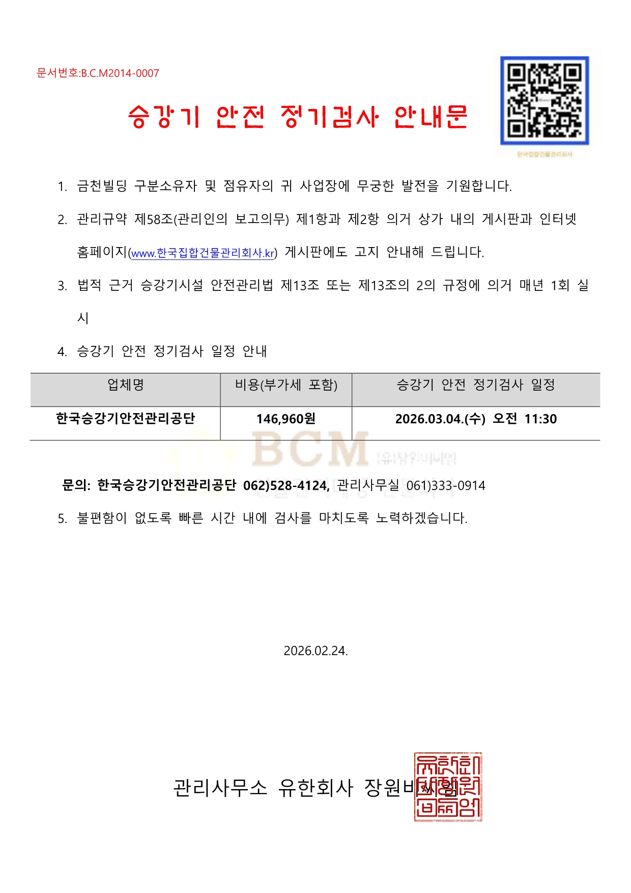 (금천빌딩)승강기 안전 정기검사 안내문
